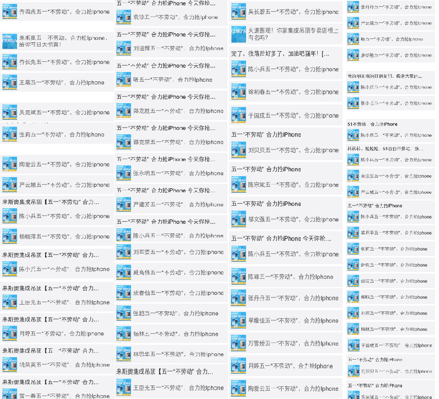 4月8日-5月12日,横跨两月,来斯奥集成吊顶为丰满五一期间家居消费者们的生活,特积极筹划“五一不劳动,合力抢Iphone”助力活动。活动以微信形式一经推出,便赢得全国消费者、经销商等各界人士的强力关注。活动瞬间于各微信朋友圈疯狂转发,爆棚的人气将活动推至市场高点。