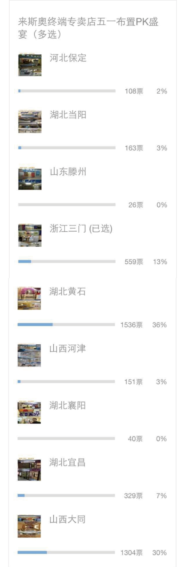 本次活动以“微信转发投票、每七天为一期”的形式开展。前三期活动,每期将终端提供的店面布置照片用以参与PK赛,针对活动开展进行票数统计且于每期的第7天(即最后一天)公开发布比赛结果;前三期内,获投票数占同期活动投票数前三甲的来斯奥专卖店,于活动最后一期(5月14~5月20日)进行终极大PK!第四期获投票数挤进前三甲,将有机赢得来斯奥公司提供的丰厚大奖!