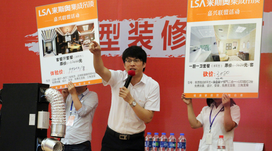 咨询、洽谈、下单、发放奖品……来斯奥集成吊顶展位工作者忙得不亦乐乎。来斯奥营销总监李总、嘉兴来斯奥专卖店潘总亲自上阵,协助来斯奥活动推广人员开展工作。热霸双雄、两线制智能开关等现场碰水演示,高质量的电器产品和新颖扣板的呈现,使得来斯奥好评如潮!更有厨卫套餐、客餐厅 套餐大放价,赢得消费者大力追捧!