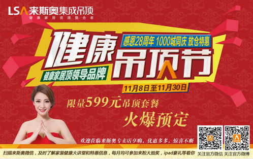 等不到电商大狂欢了,那么是不是想要购买集成吊顶的消费者就享受不到双11这样强大的优惠狂欢了呢?来斯奥集成吊顶表示,不用等双11,来斯奥让你天天过双11!11月8日-11月30日,来斯奥将推出“健康吊顶节”活动,将健康的家居环境带给消费者。届时,来斯奥“健康小卫士”将为爱家护法,国民女神柳岩指定的四款健康吊顶套餐将以超低价限量发售,更有预约折扣券、下单折上折、免单大奖等惊喜等着你。
